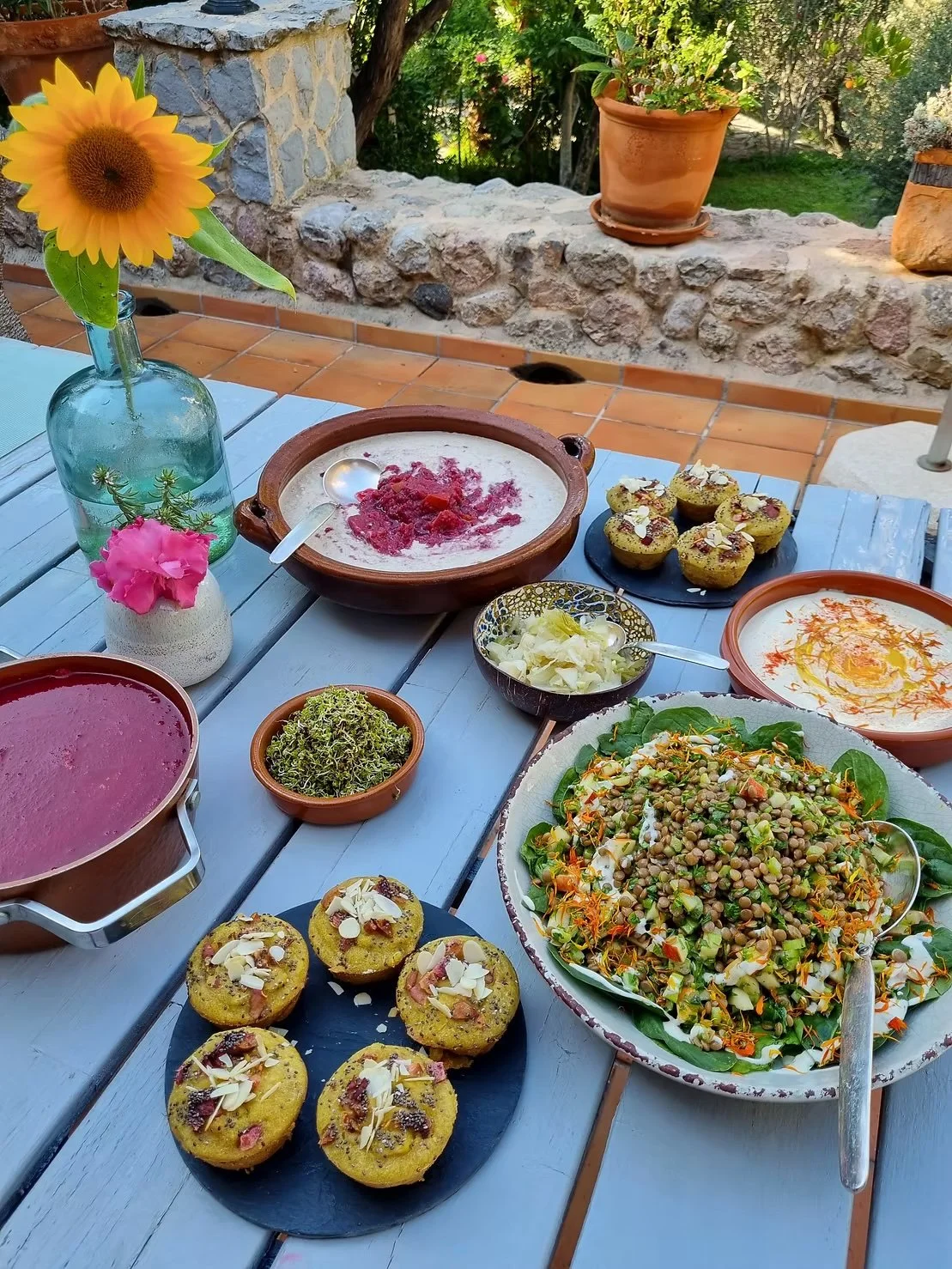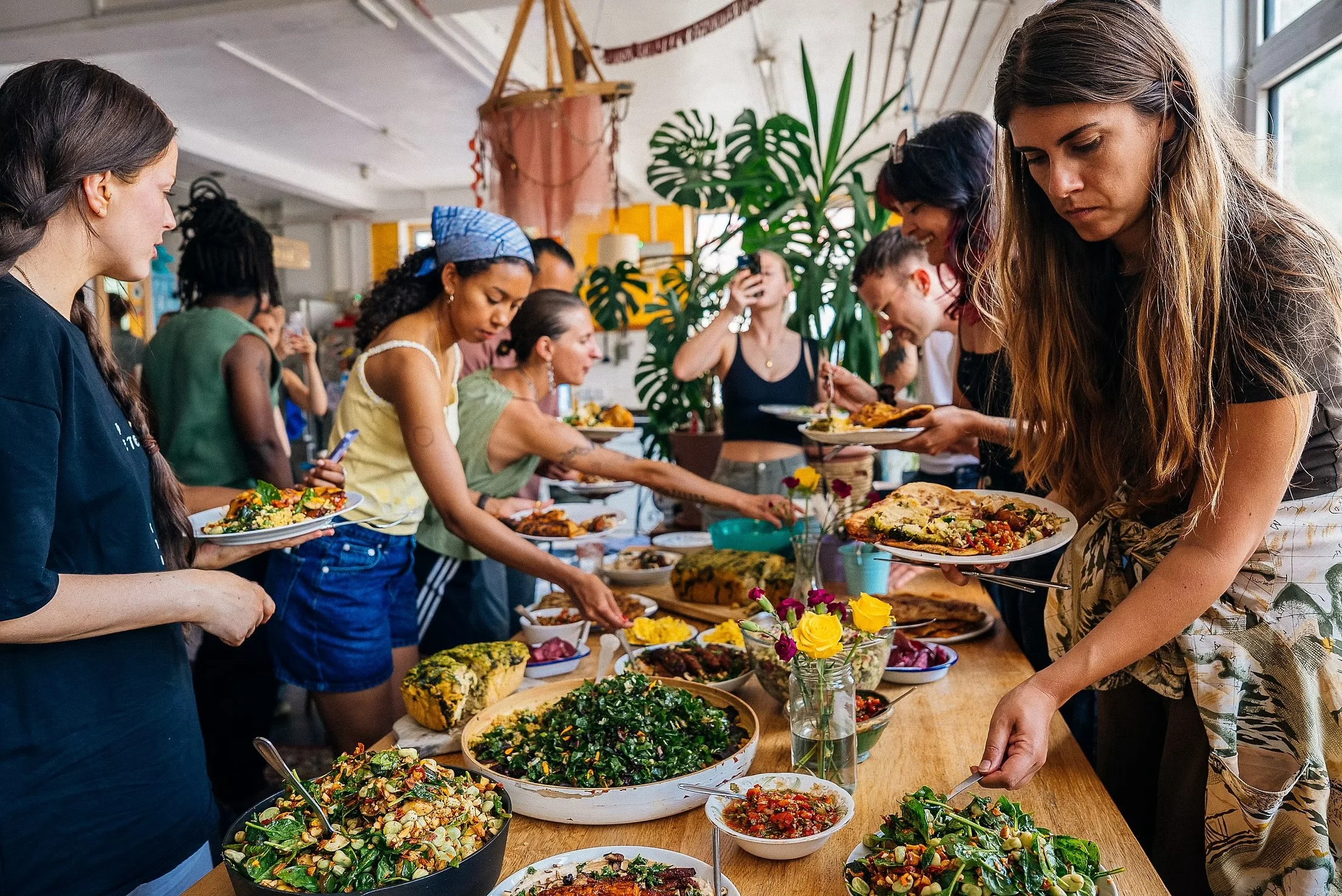 The experience includes a three-course seasonal plant-based dinner prepared by our kitchen team. The menu is designed to be generous, healthy and full of flavour. Meals are shared together at communal tables, creating a relaxed environment for conversation and connection.